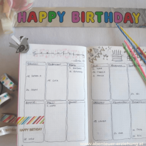 Das ist Geschmackssache, allerdings haben meine Mädels eine riesige Sammlung an Washi-Tapes (werden ja sehr gerne auch unter den Freundinnen verschenkt). Damit lassen sich Seiten verzieren, Unterteilungen schaffen oder auch mal ein Schreibfehler überkleben.